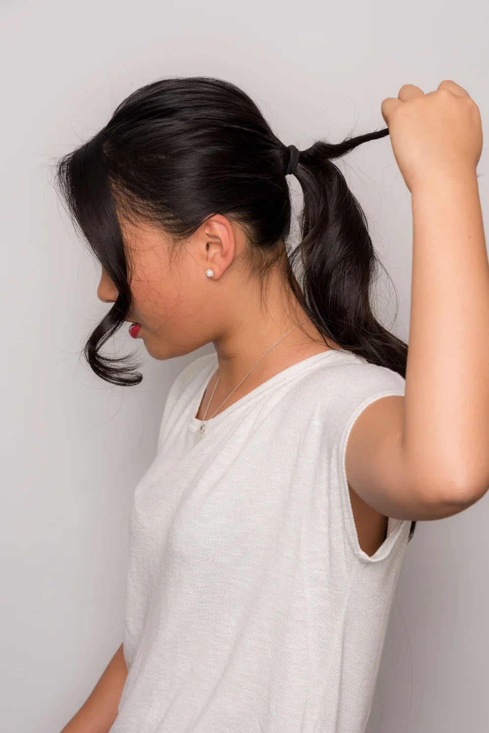 3. ヘアゴムを使用し、きつめのポニーテイルにする。