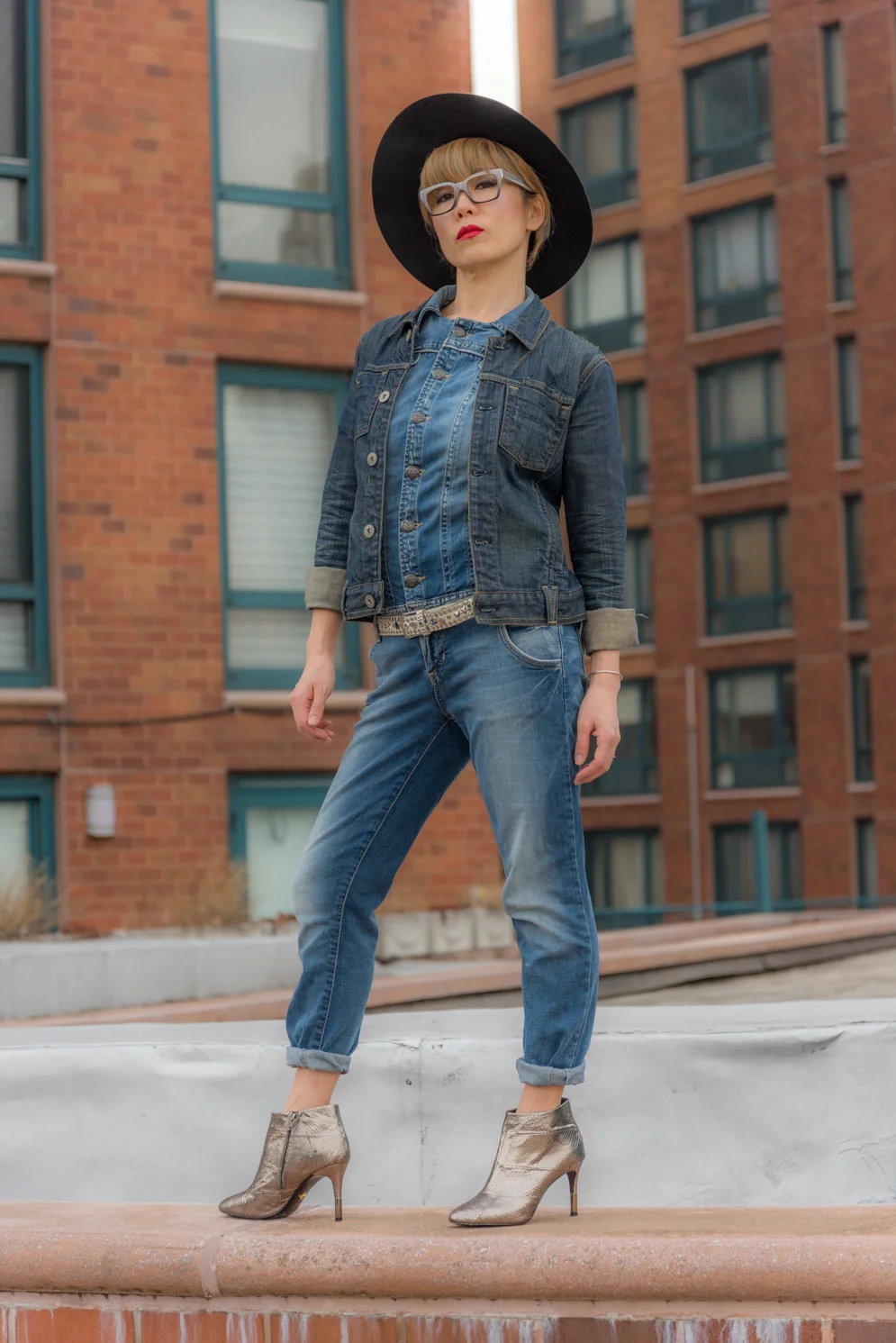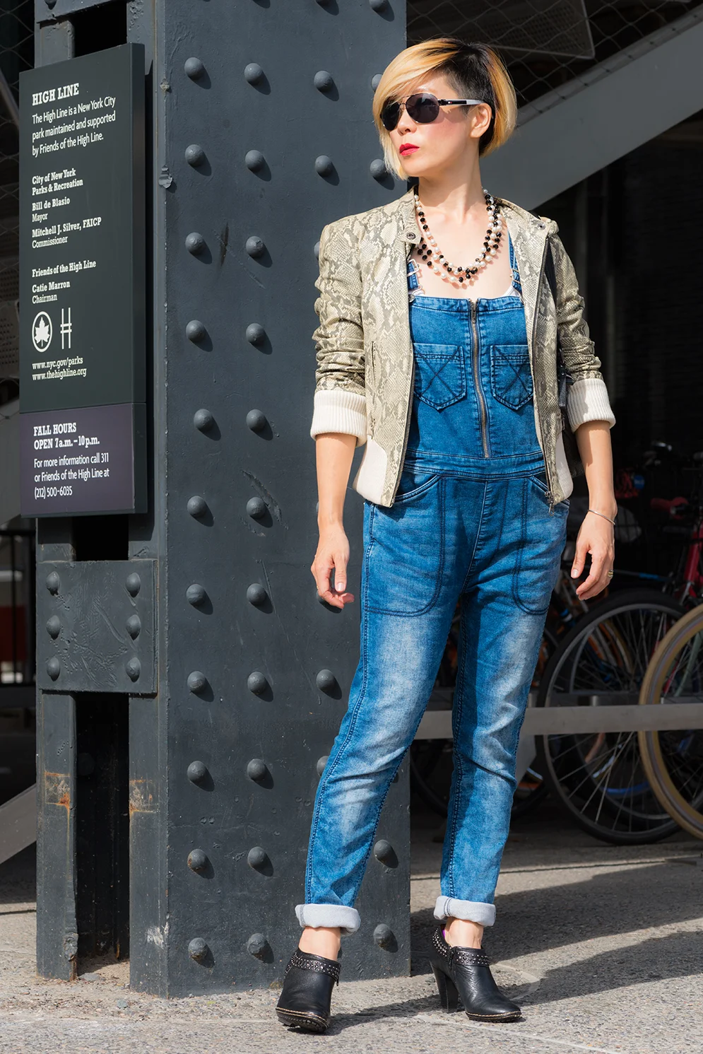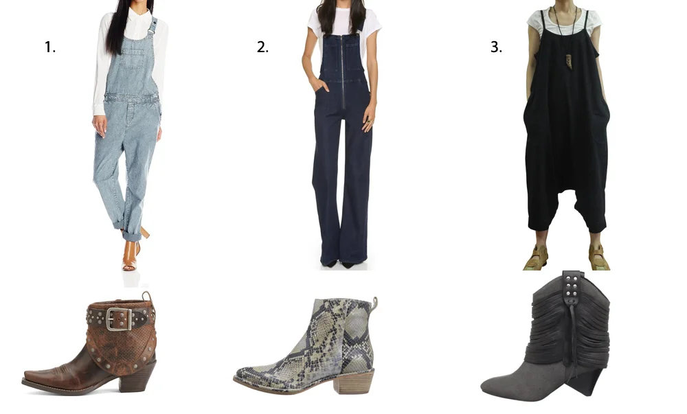 /I love denim overalls and I wear them often. lately, I see overalls in many fashion magazines. Overalls are the come-back item for this Fall. The two photos above are from last year, 2014, and early this year, 2015. I was wearing slim overalls, but this fall, I would like to wear a more loose fitting overalls. It could be a good combination with short boots. This is my styling suggestion, overalls & short boots for Fall 2015. Which styling combination is your favorite below? Me? I like style No2, the bell bottom overalls and snake print ankle boots.