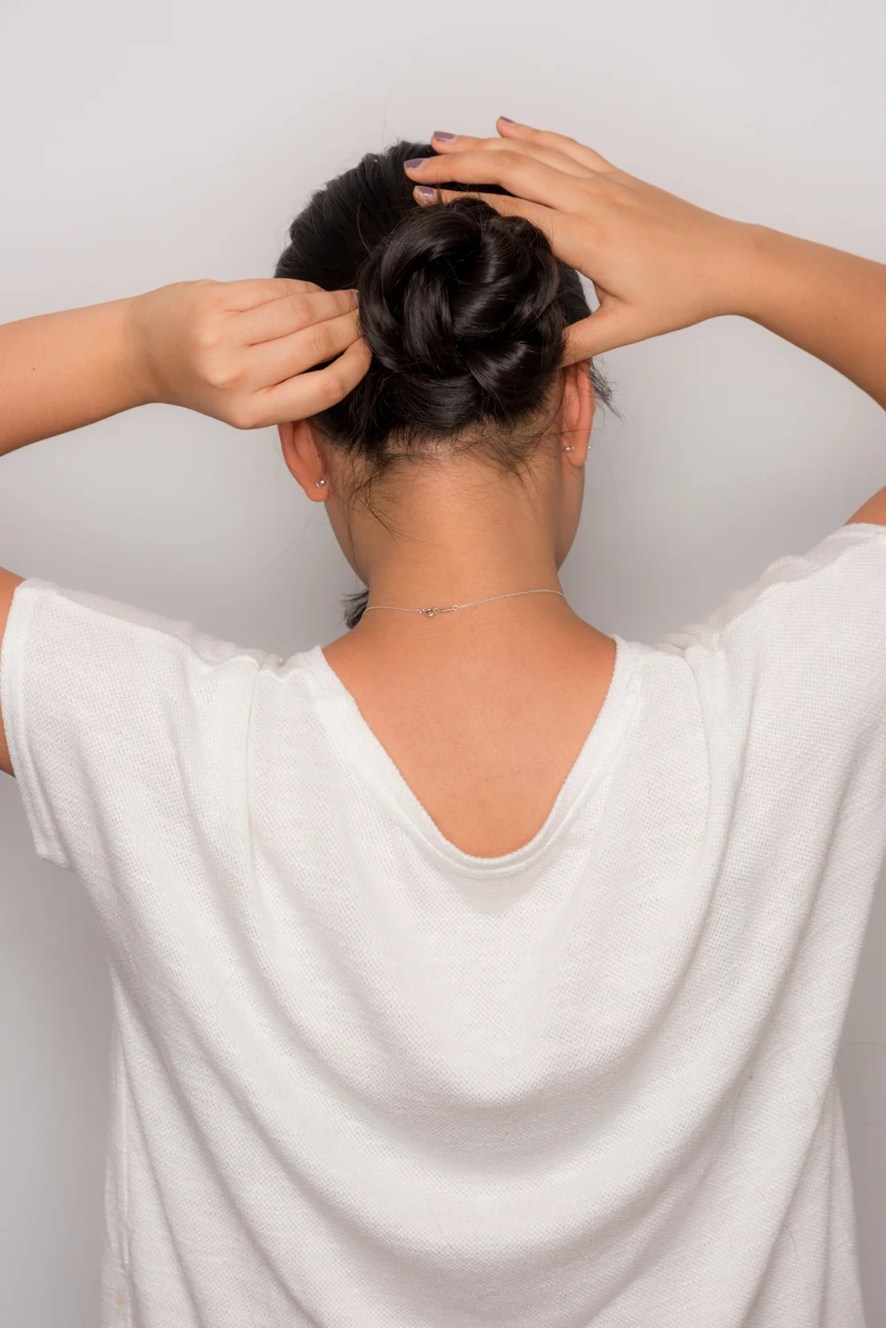 8, Open the pin and slide the pin into the ponytail part and above the ponytail part so the bun will stay on your head.