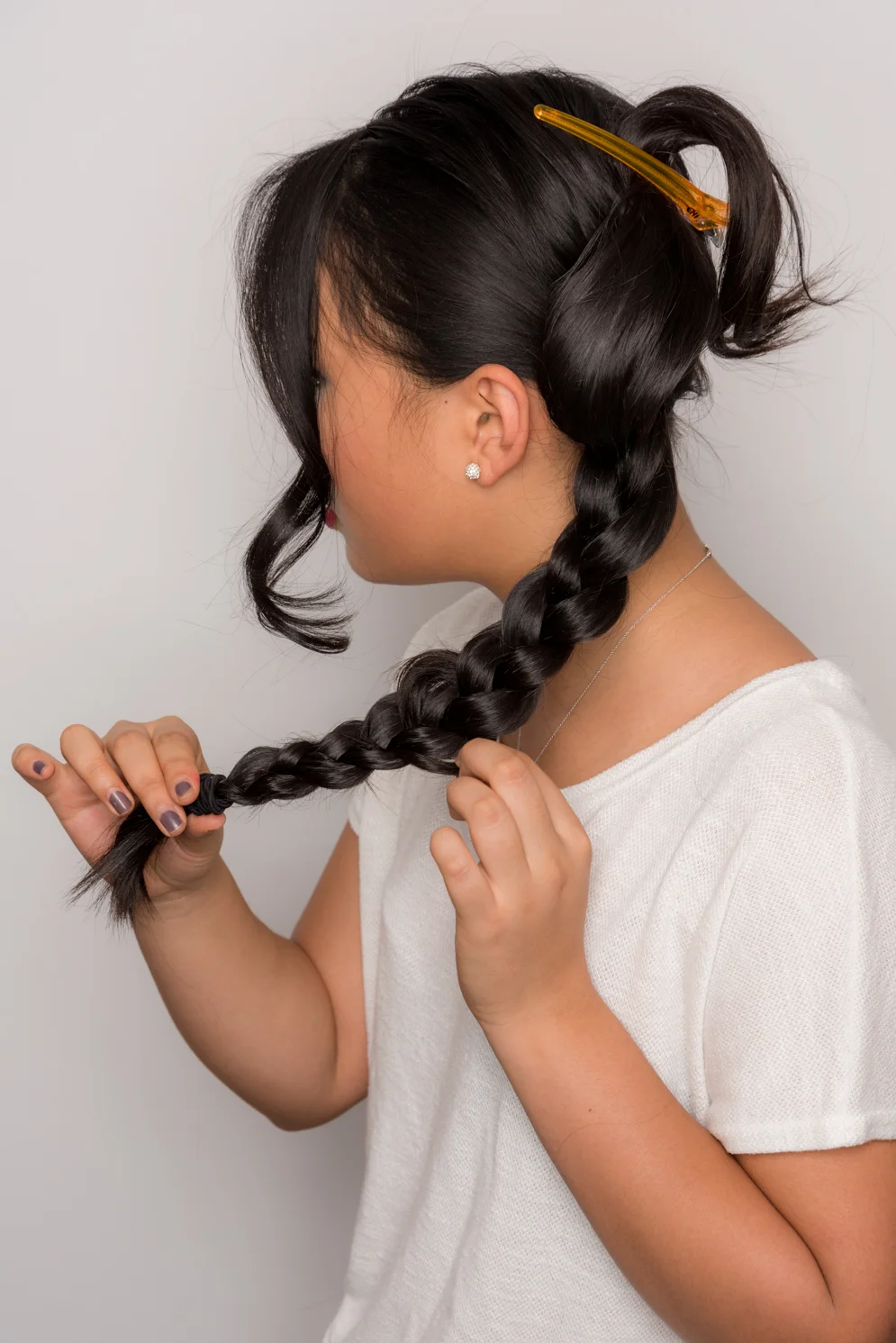 8. 上に留めておいた髪をおろして、三つ編みを作る。