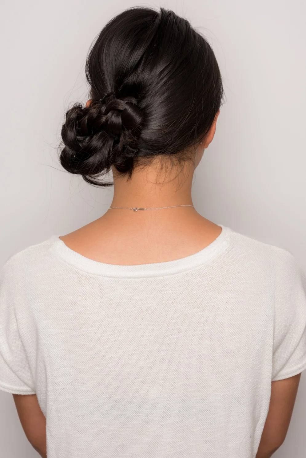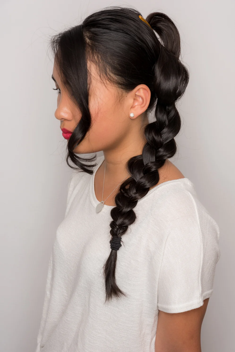 10. Bring the braid up and around the hair band and set braid on the ponytail.
