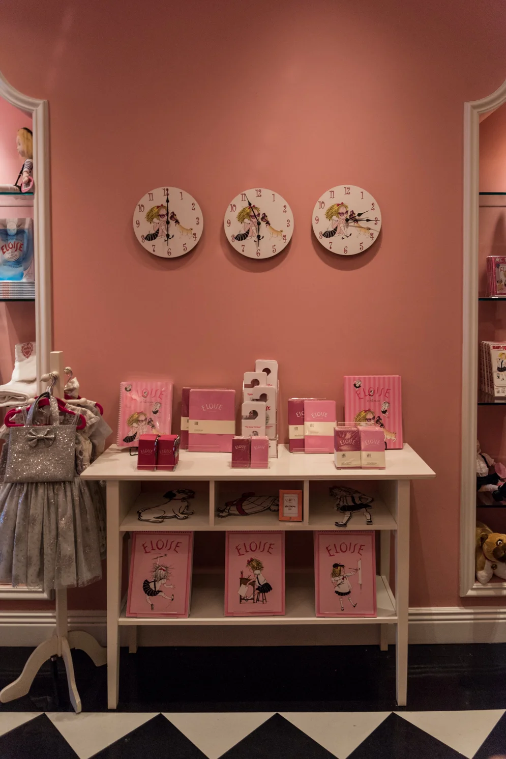 Eloiseちゃんって(エロイーズ)聞いた事ありますか?Eloiseは、子供向けの絵本の主人公で10950年代に作家のKay Thompson (1909–1998)と、画家のHilary Knight (b. 1926)によって書かれたました。Eloiseはニューヨークのプラザホテルの最上階にナニー(子供の世話をする人の事)と犬、亀と一緒に住んでいるという設定です。私も4歳の子供を持つ母親ですが、息子なのでゴレンジャーや、スーパーヒーローには詳しくなったけど、Eloiseちゃんは知らなかったなー。私も一度でいいから、こんなピンクと白の壁にゼブラ柄の絨毯のお部屋に住んでみたい!もう全てが可愛い。プラザホテル内にはこのお店の内装のような夢のEloise スイートルームがあって、そのお部屋はファッションデザイナーの Betsey Johonsonがデザインしたそうです。ちなみに、一泊のお値段は$2,043ドルからだそうで、ニューヨークならではですね。