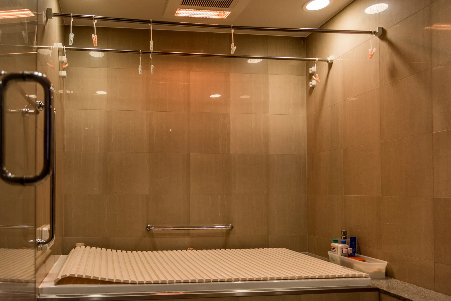 Japanese bathtubs are deeper than conventional Western bathtubs, and the water is heated in the bathtub. The bathtub is meant for soaking and relaxing after the body is clean. There is usually a cover over the bathtub to be used when finished. The water is not drained but reused. There is a washing area outside of the bathtub. The washing area has a faucet with hot and cold water, and a shower attached to a hose. A small stool and bowl is used for sitting while cleaning. Some ofuro rooms in homes are also use for drying clothes. The used bath water can be recycled for use in a washing machine.