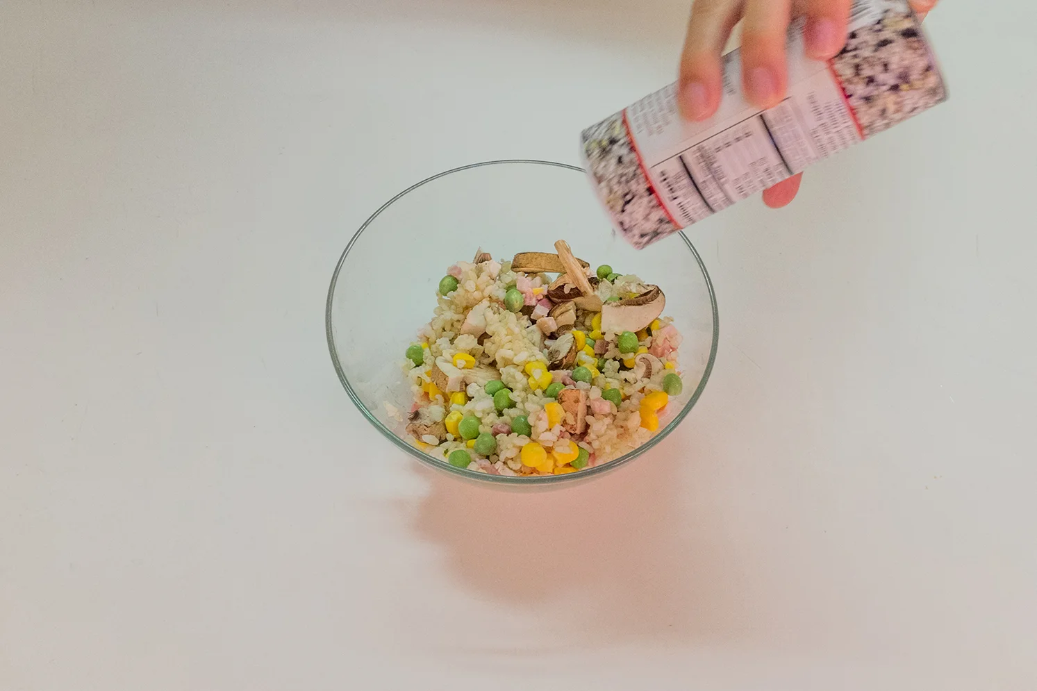 1. オーブンを200度に温めておく。ご飯、マッシュルーム、ハム、チーズ、グリーンピースをひとつのボウルに投入して混ぜる。