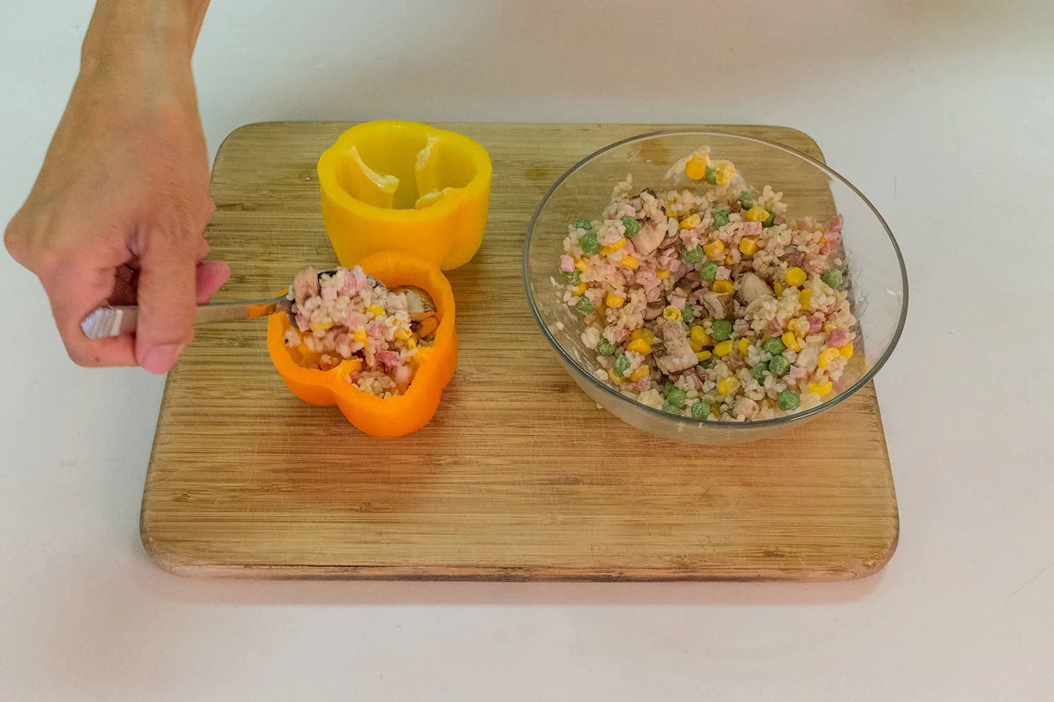 7. パプリカの中にご飯を詰める。