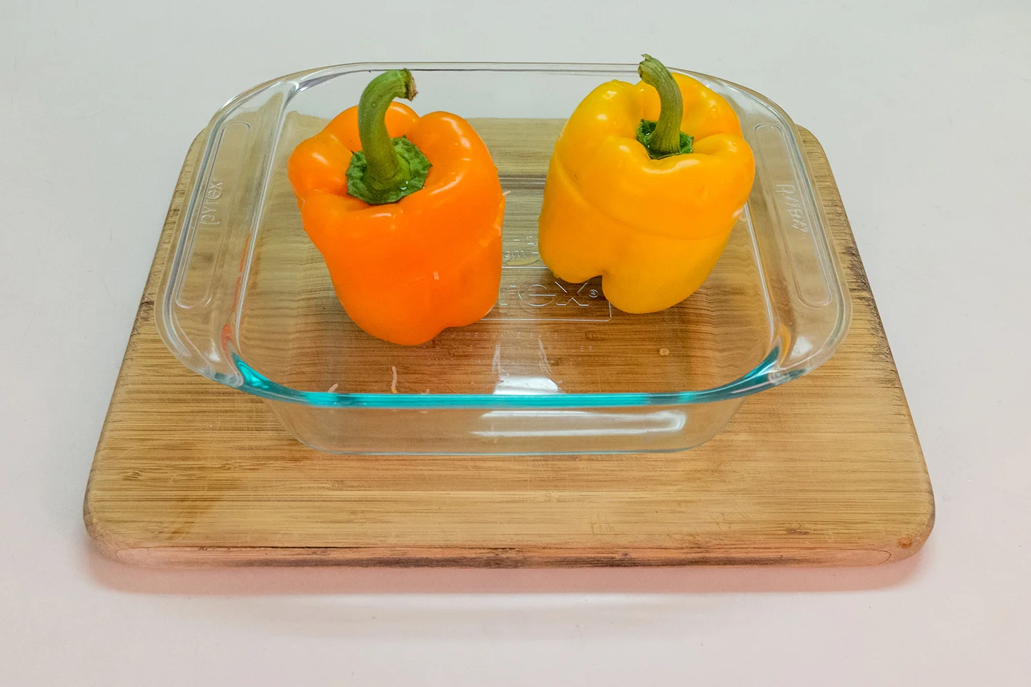 9. オーブン耐熱皿にパプリカを乗せて、パプリカの上部を蓋変わりに使い200度のオーブンで30分焼く。