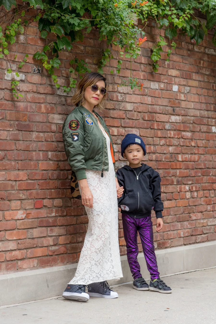 Hello, I love fall fashion. I'm enjoying layering clothes, hat and scarves. I love feminine sexy dresses, and I like to mix it up a little bit. Today, I'm wearing a long white lace dress with a back slit and deep V-neck. It is a beautiful sexy dress. I mix it up with a boy's size MA-1 over. For my son's styling, he is wearing sparkling leggings and an oversized Hanes hoodie. Please don't tell him the leggings is for girls:)