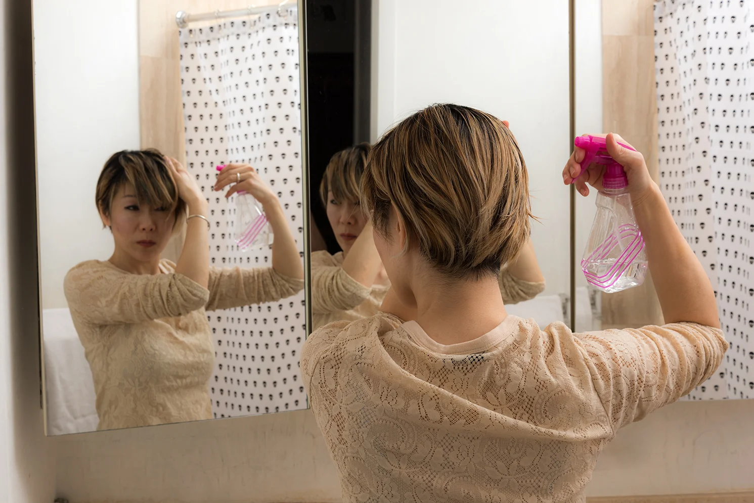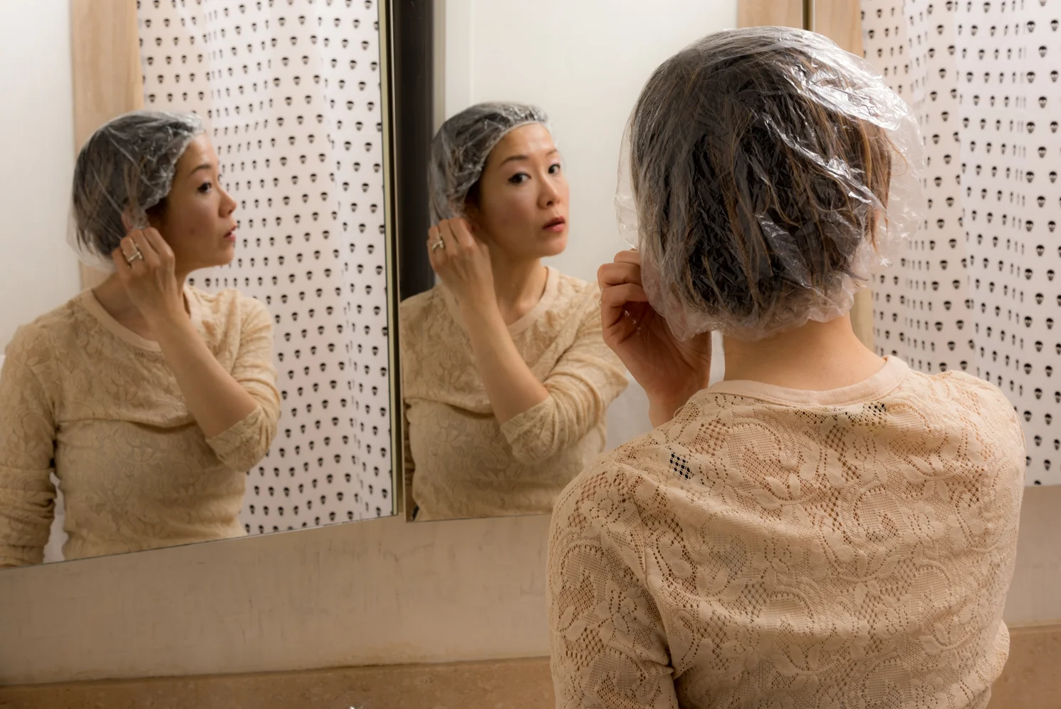 6. シャワーキャップをかぶり、最低30分はそのままにしておき、シャンプー&リンス。