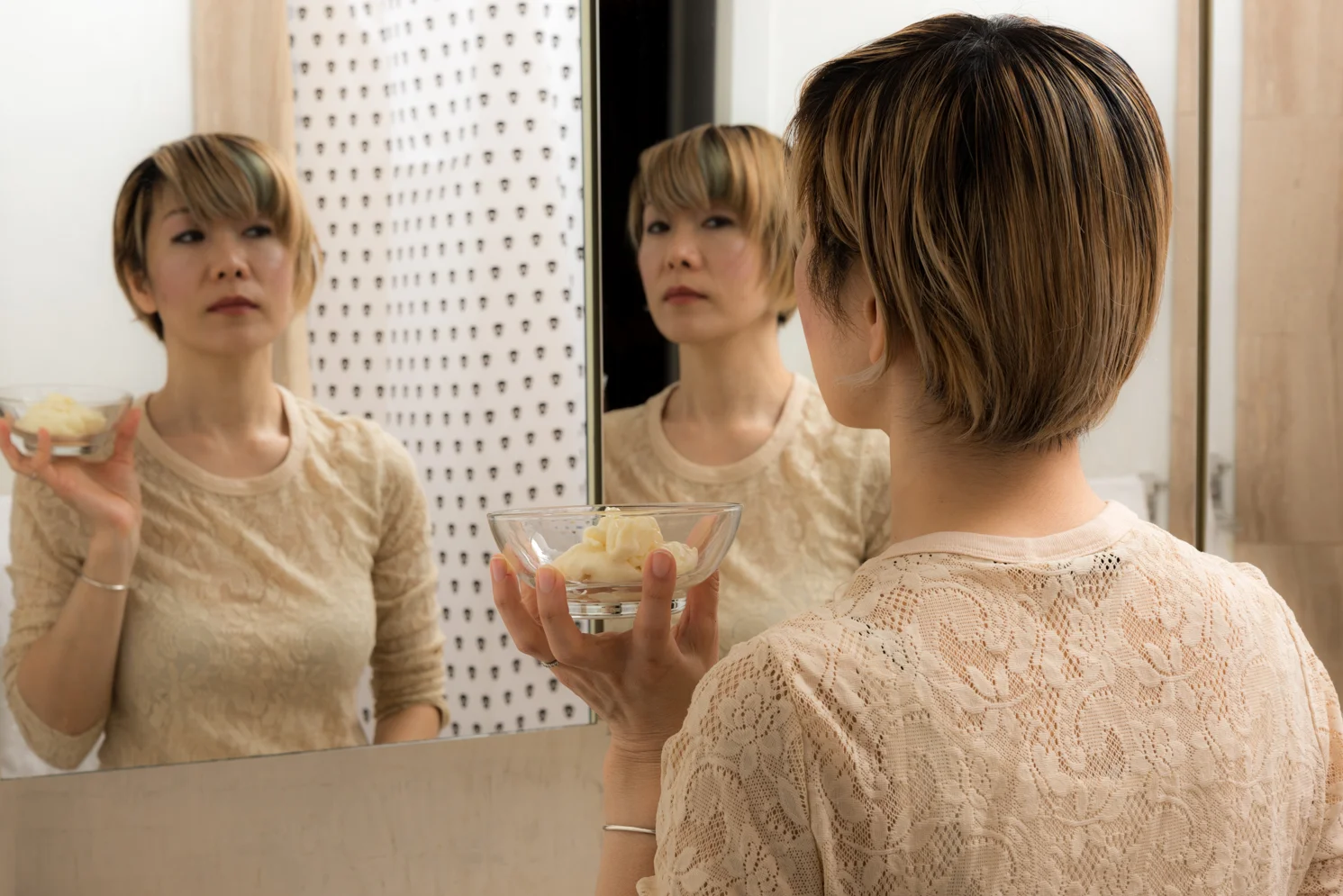 4. 毛先からマヨネーズを髪に付けていく。頭皮に近い髪にはマヨネーズを付けないようにしてください。