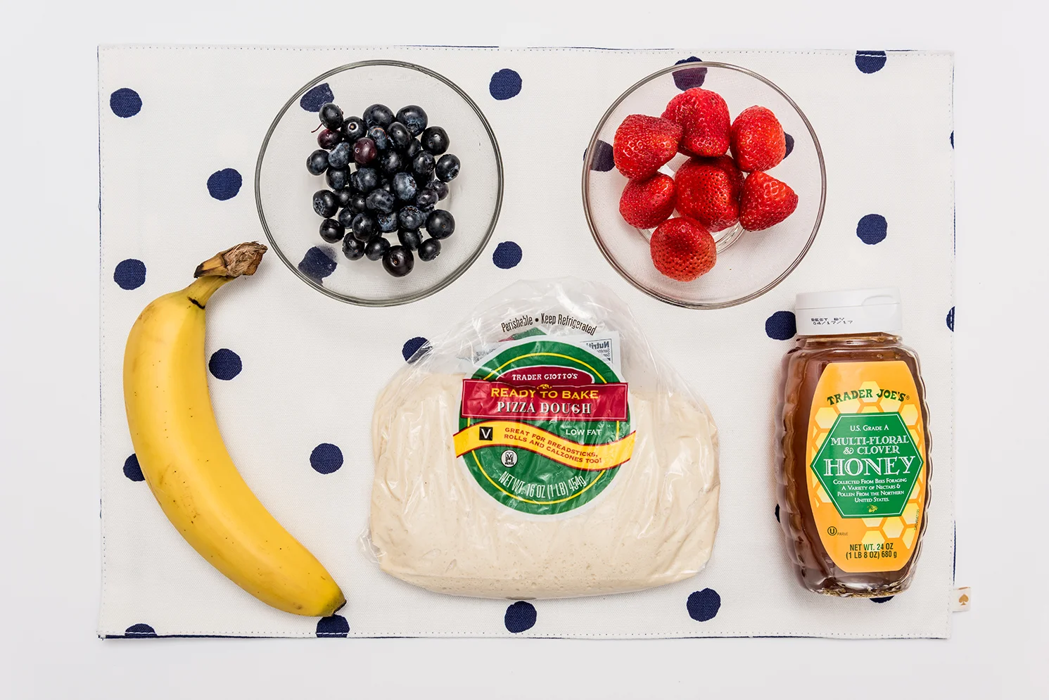 /You will need, pizza dough, a banana, strawberries, blueberries and honey.