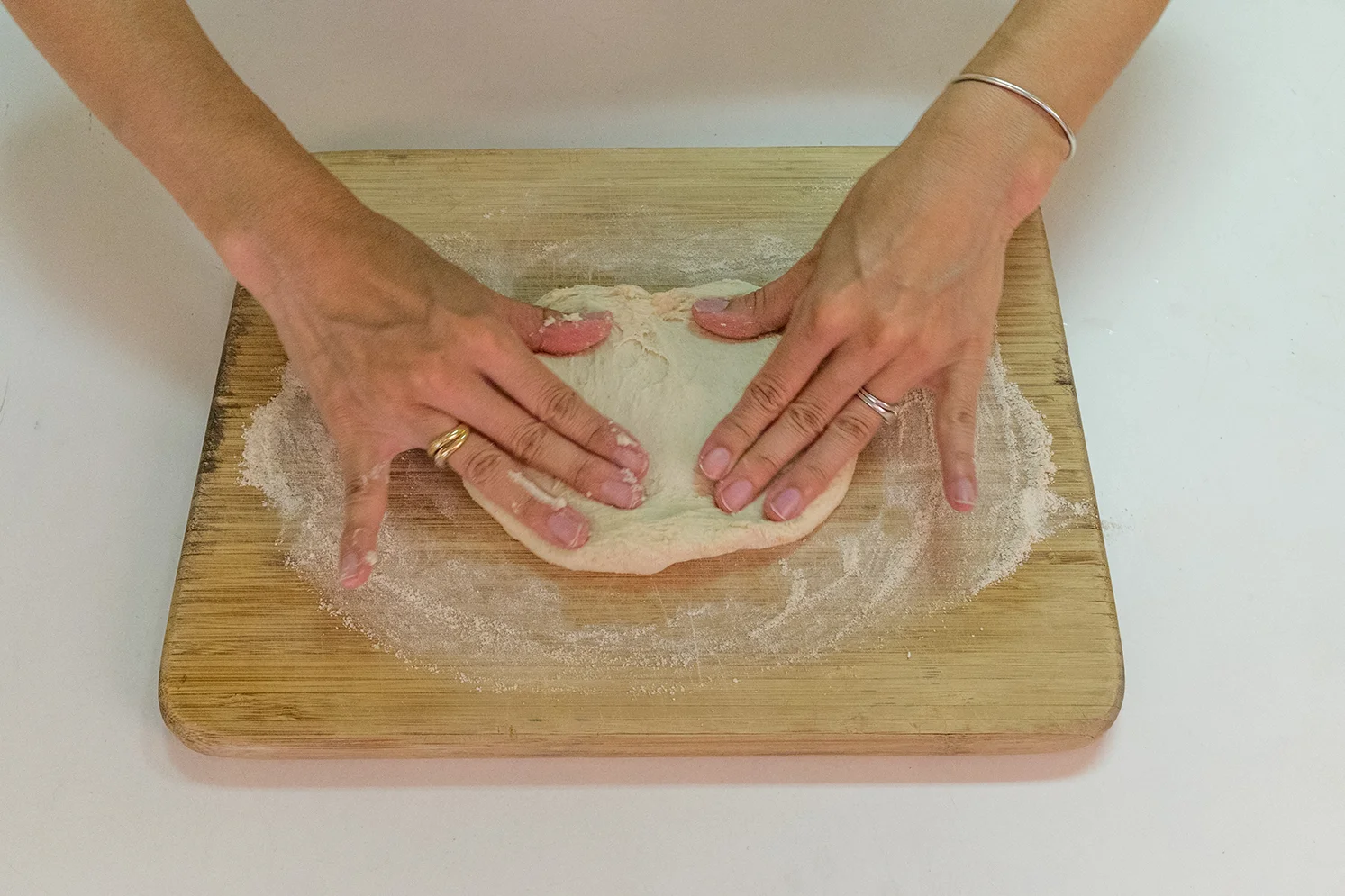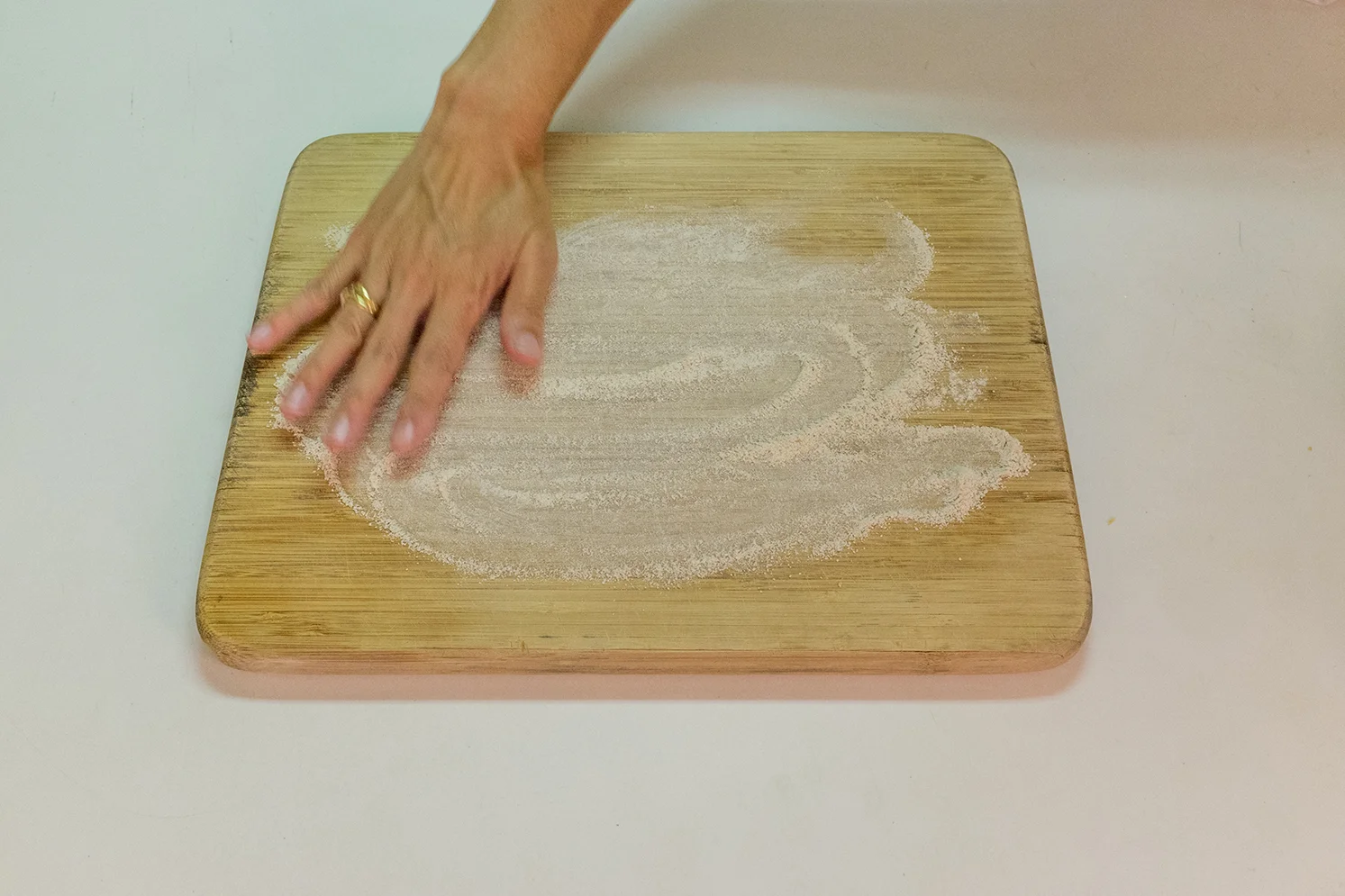3. 小麦粉をまな板にまんべんなく伸ばす。