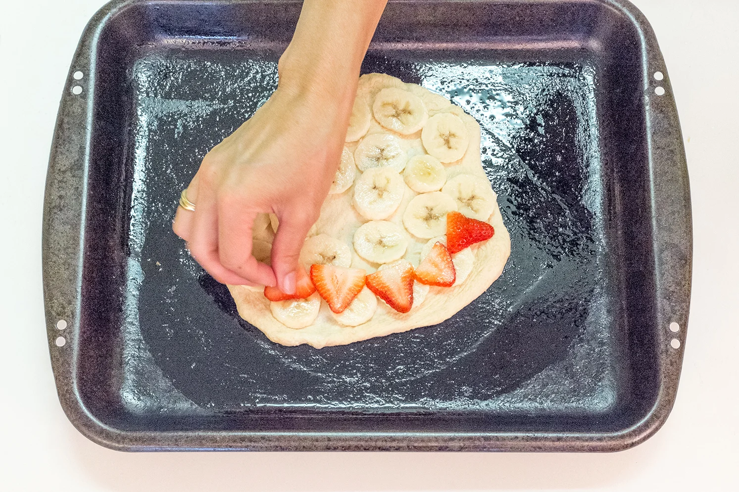 材料:ピザ生地、バナナ、いちご、ブルーベリー、はちみつ。