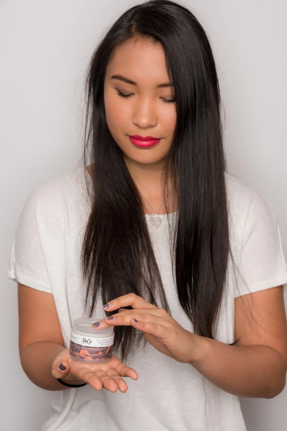 1. If you want to have more body and texture, you can try to use dry shampoo paste. Take a small amount of the dry shampoo past on your finger and spread it in your hand.