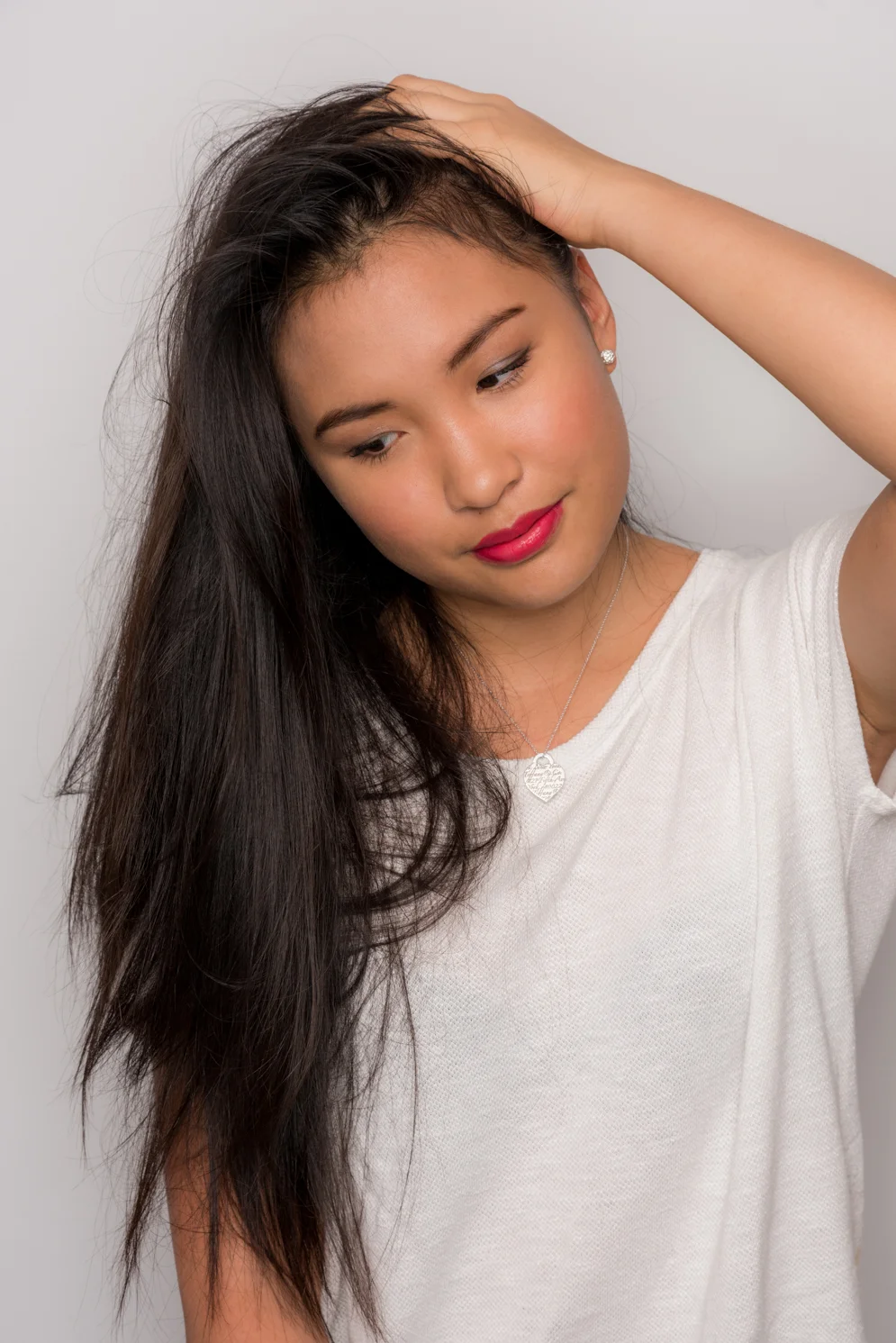 1. 髪のトップを持ち上げて、髪の根元に向けてドライシャンプーをスプレーする。
