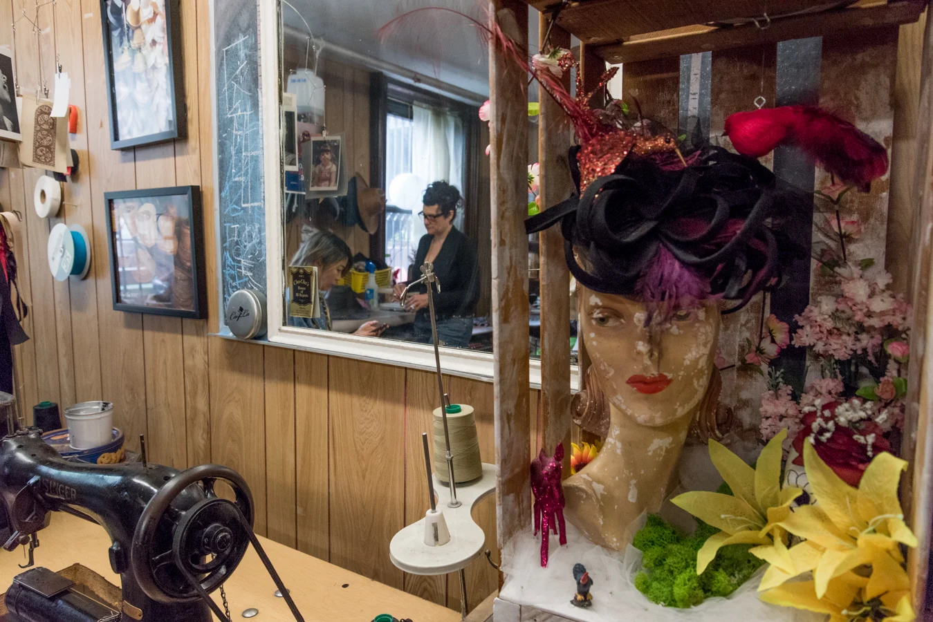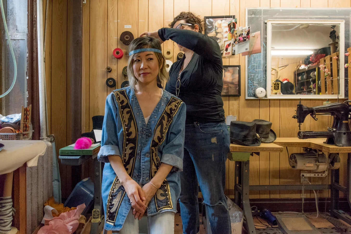 /Hello! Do you like to wear hats? Hats are part of my life. I probably wear hats 300 out of 365 days of the year. My favorite hat designer is Cha-cha. She makes each hat by hand at her studio located in the lower east side of NYC. I like her hats because I can really see her spirit in her hat designs. Yes, She is very ROCK! A few weeks ago, she made a custom hat for me! I visited her studio, I picked the shape I want, a material I like, and we discussed design. She offered me a 50's vintage material to remake my custom hat! ( The hat I'm wearing in the photo above is the vintage hat.) I respect someone who makes and sells handmade things and I would like to support that.